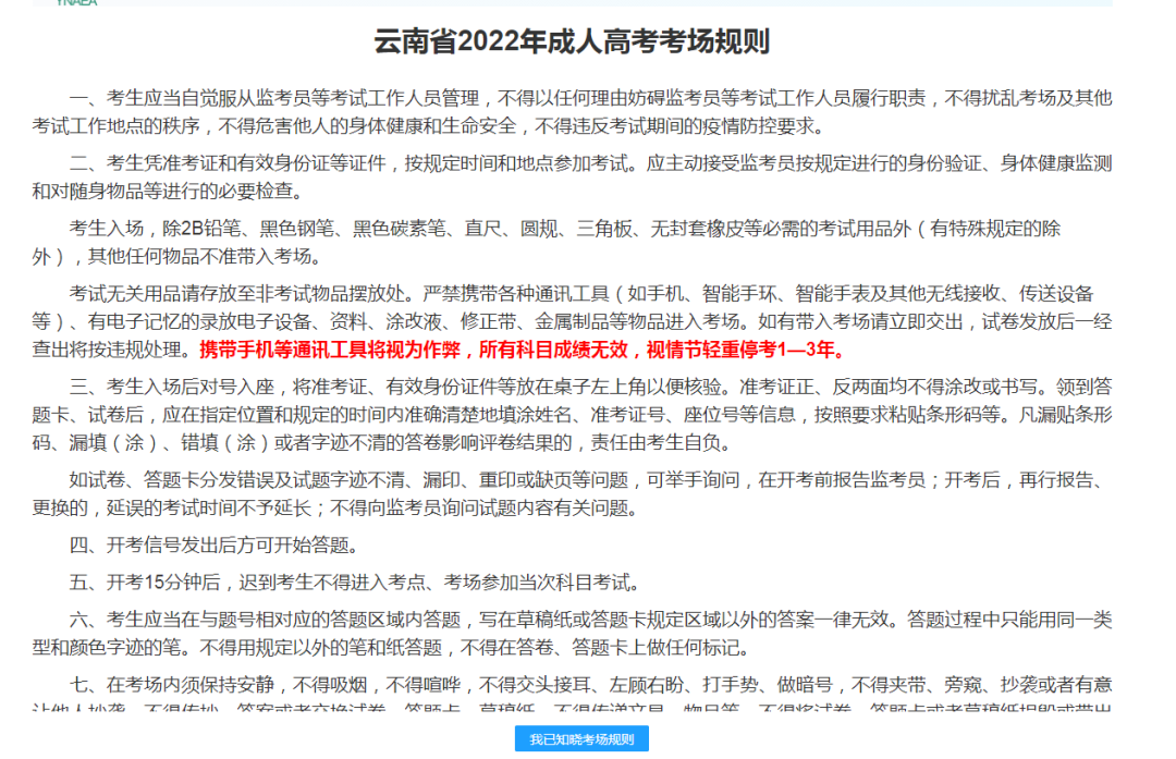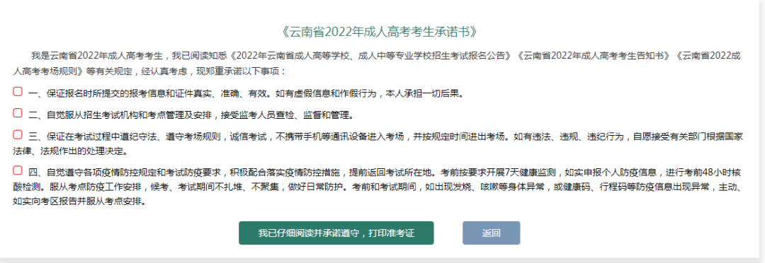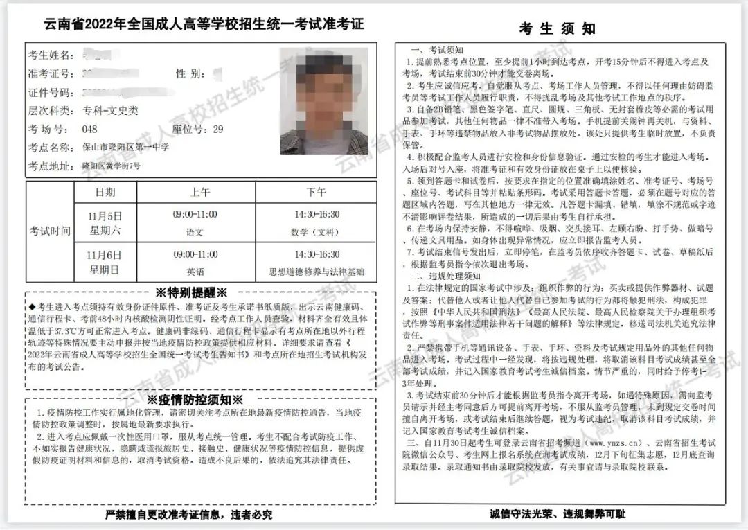 考生凭《准考证》、《身份证》、《云南省2022年成人高考考生承诺书》(纸质版)、彩色打印日期为4日的“云南健康码”绿码、“通信大数据行程卡”及其他各地考区要求的需提供的材料进入考点,其他事项按《考生告知书》要求准备,在进入考场时将教材交至监考员处核验并存档,所需证件和材料不齐均不得进入考场。