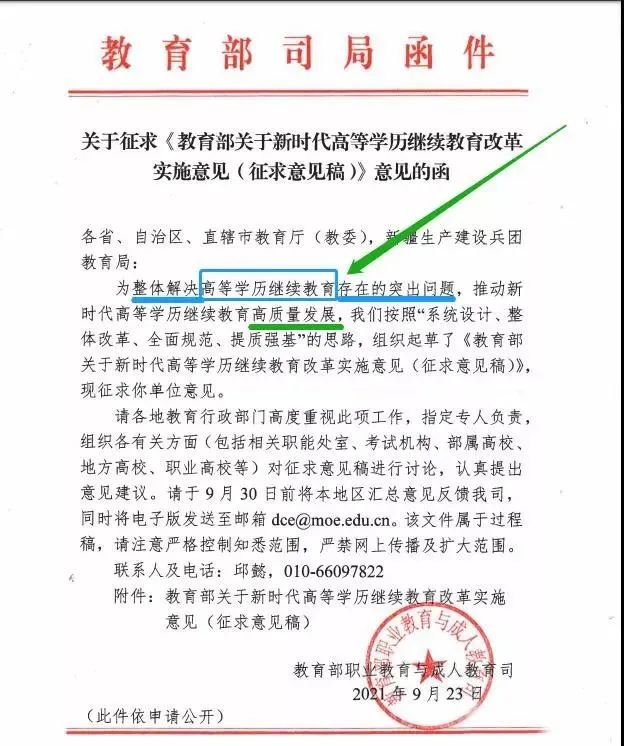 2021年,教育部职业教育与成人教育司发了一个征求意见函:高等学历继续教育改革实施意见(征求意见稿)。