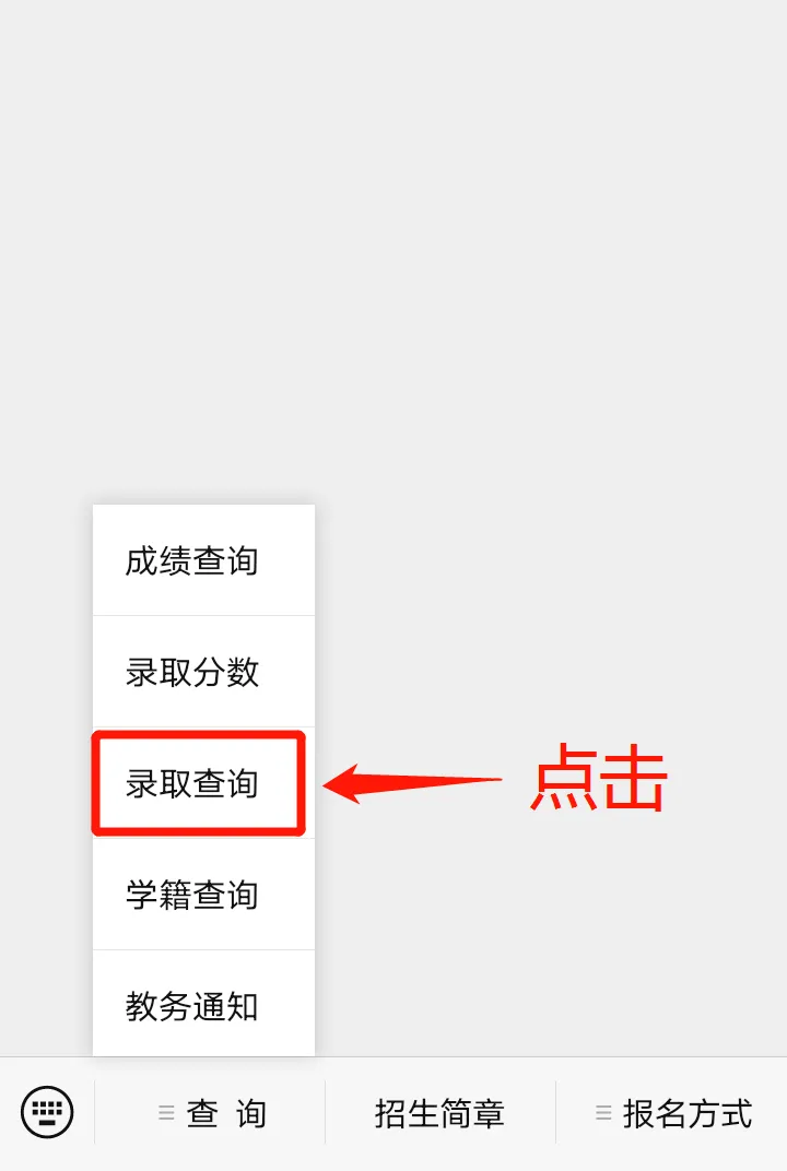 公众号下角-点击菜单【查询】→【录取查询】,输入准考证号 和 身份证号 即可查询。