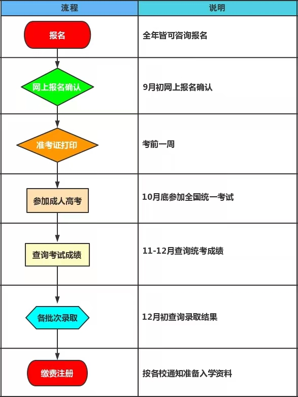 第四步:10月打印准考证参加考试;11月份出成绩,12月份录取,12月底到1月初各校根据录取情况发放录取通知书;